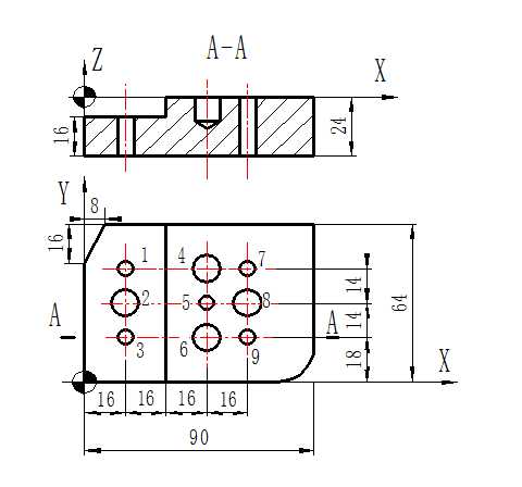 本實例中零件圖及毛坯位置圖如圖3-2所示,其中,#1、#2、#5、#6、#7、#8、孔深10mm,#3、#4、#9為通孔。由於零件較小,外形規則,采用平口(kǒu)鉗(qián)裝夾即可,選擇以下四種刀具進行加工:1號刀為φ50mm端銑刀,用於銑上表麵; 2號刀為φ20mm立銑刀,用於銑左台階(jiē)麵; 3號刀為φ6mm鑽頭, 4號(hào)刀為φ11mm鑽頭,用於加工孔。通過測量刀具,設定(dìng)補償值用(yòng)於刀具補償。該零件工(gōng)藝規程見表3-3,工件坐標係的建(jiàn)立,參考點(diǎn)及程序零點的確定如圖3-2所示。