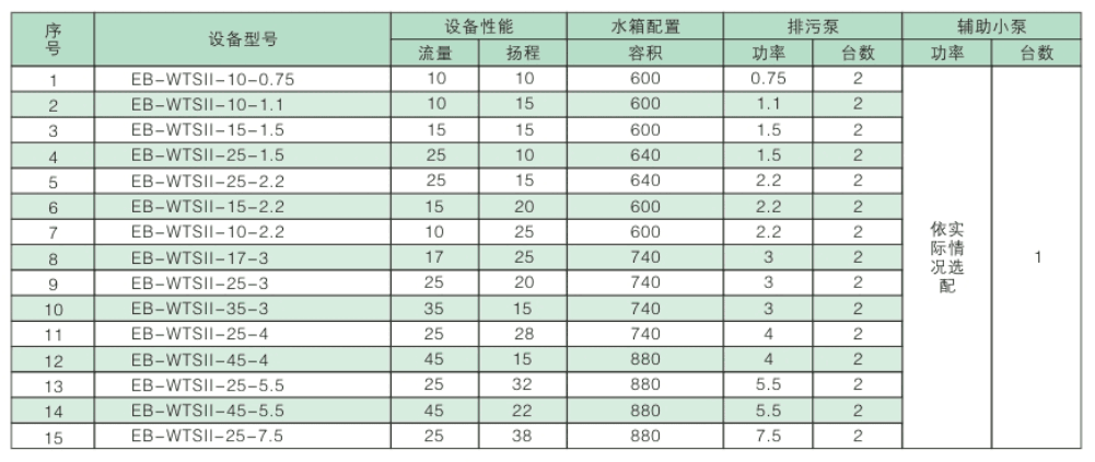 EB-WT係列(liè)智能汙水提升設備型(xíng)號廣、能滿足不同容積、不同揚程、不(bú)同工況用戶的實際(jì)需求。適(shì)用於普(pǔ)通公共建築型,廣泛應用於地(dì)下設(shè)施中(zhōng)所有需要強排汙(wū)水的場所。