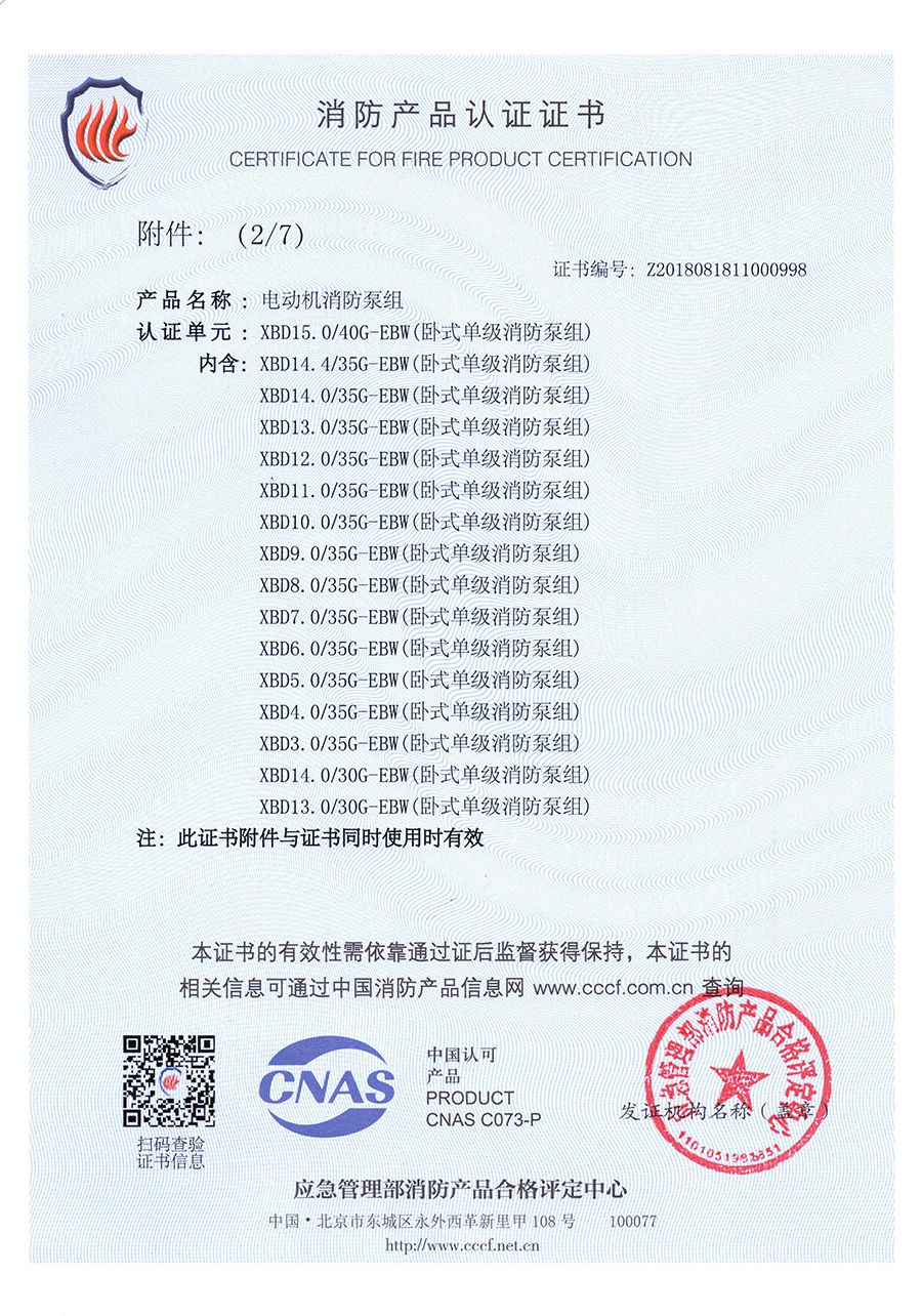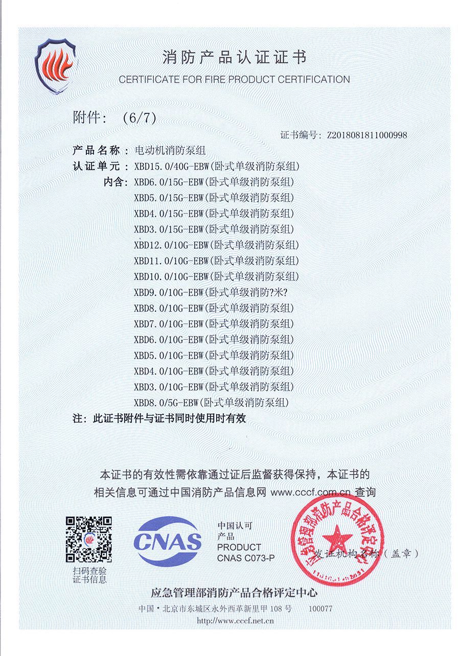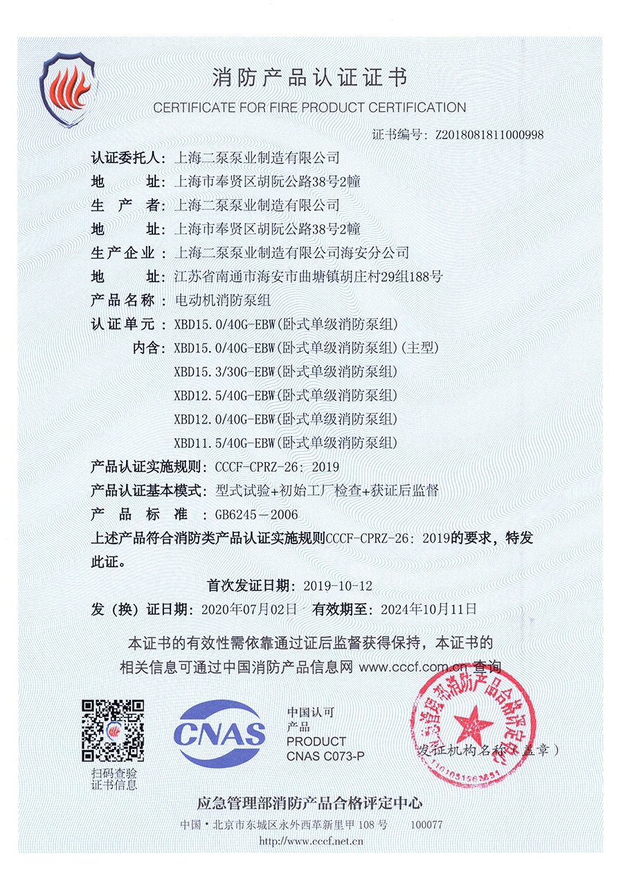 臥(wò)式單級EBW-消防產品(pǐn)認證證書