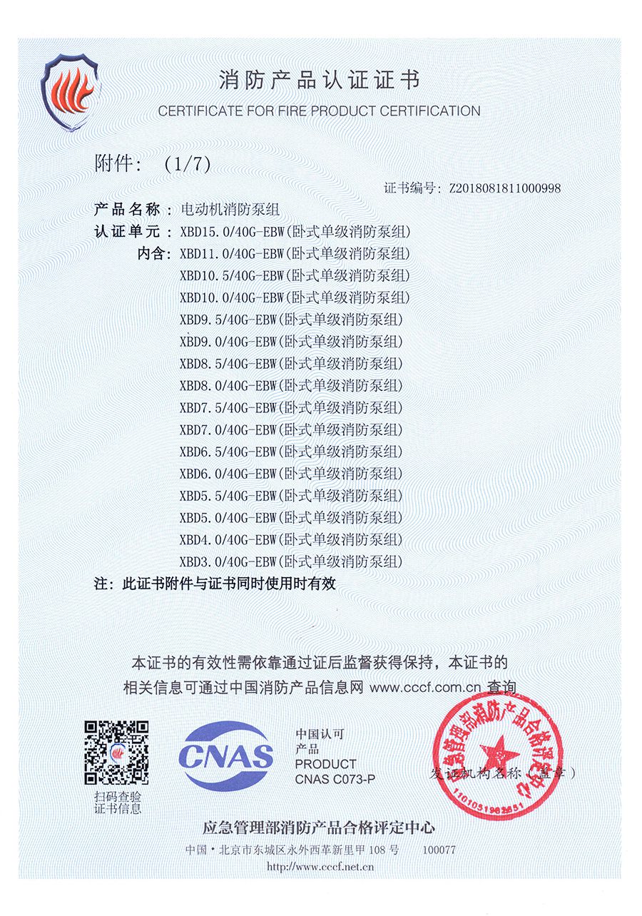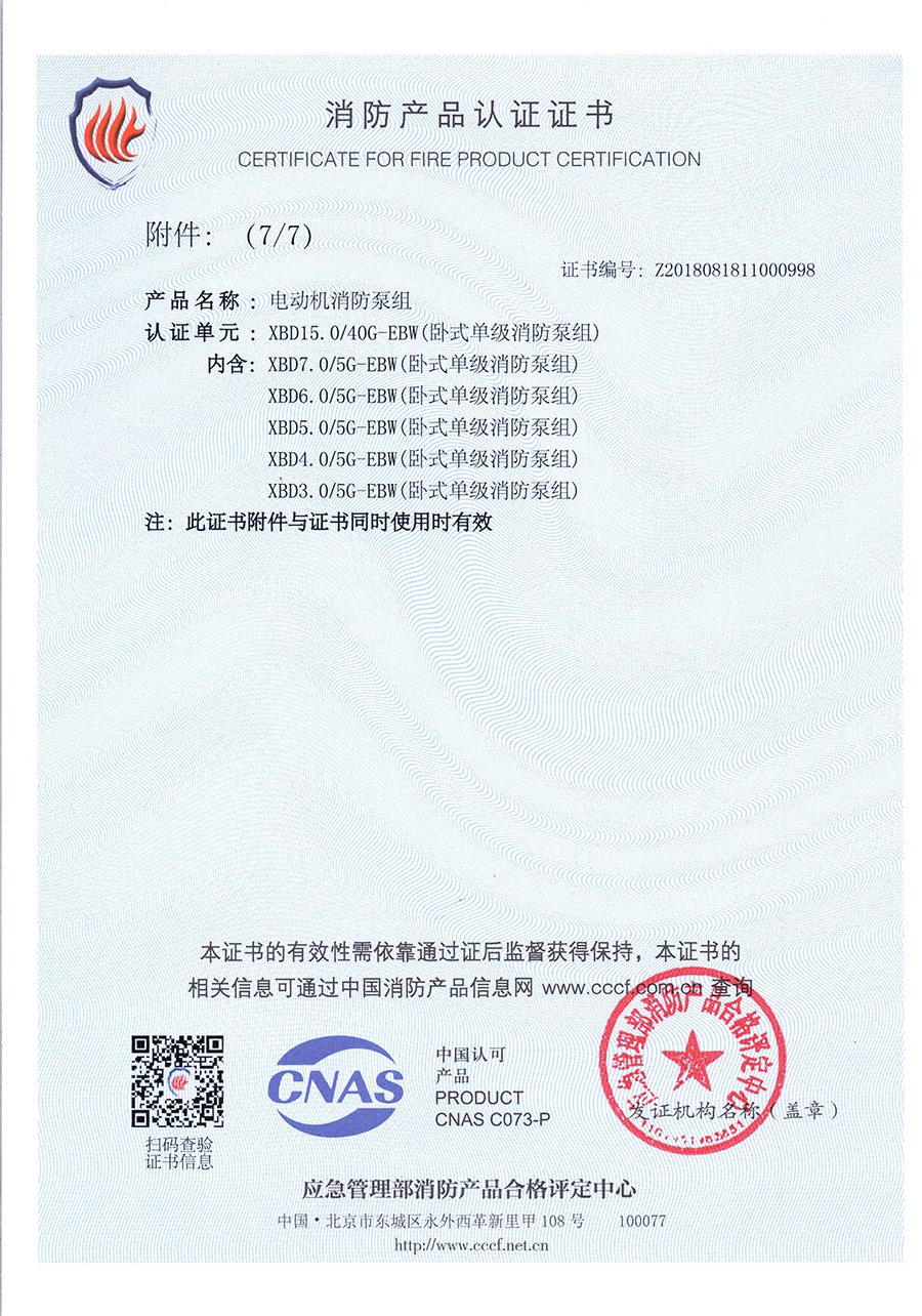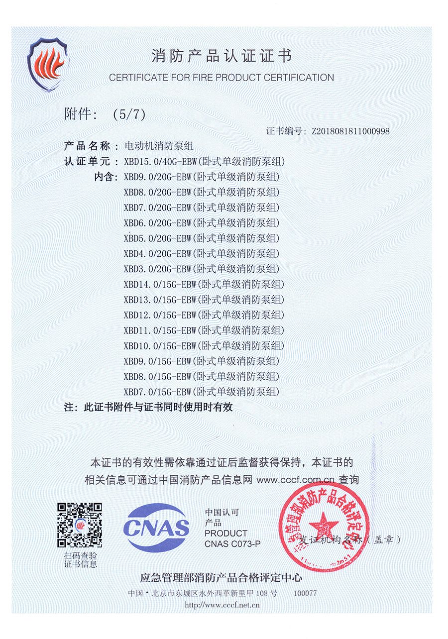 臥(wò)式單級EBW-消防產品(pǐn)認證證書
